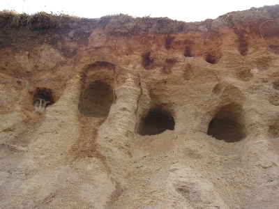 Naše nedělní neplánovaná návštěva proběhla v pohodě, bylo pěkné počasí, na Pískovně bylo plno lidí. Dnes na apríla jsme Pískovnu navštívili po dvou dnech znovu. Jeden by řekl, co se za tak krátkou dobu může stát. A vidíte, stalo se. Nějací vandalové poničili jižnější stěnu pro břehule u jižní velké tůně. Asi neměli co na práci, vzali kladiva (viz obrázek, pořádně se koukněte do levé díry...) a dělali jeskyňky, díry, sloupy, průchody a podobné pískové útvary. Část stěny se jim také podařilo strhnout.